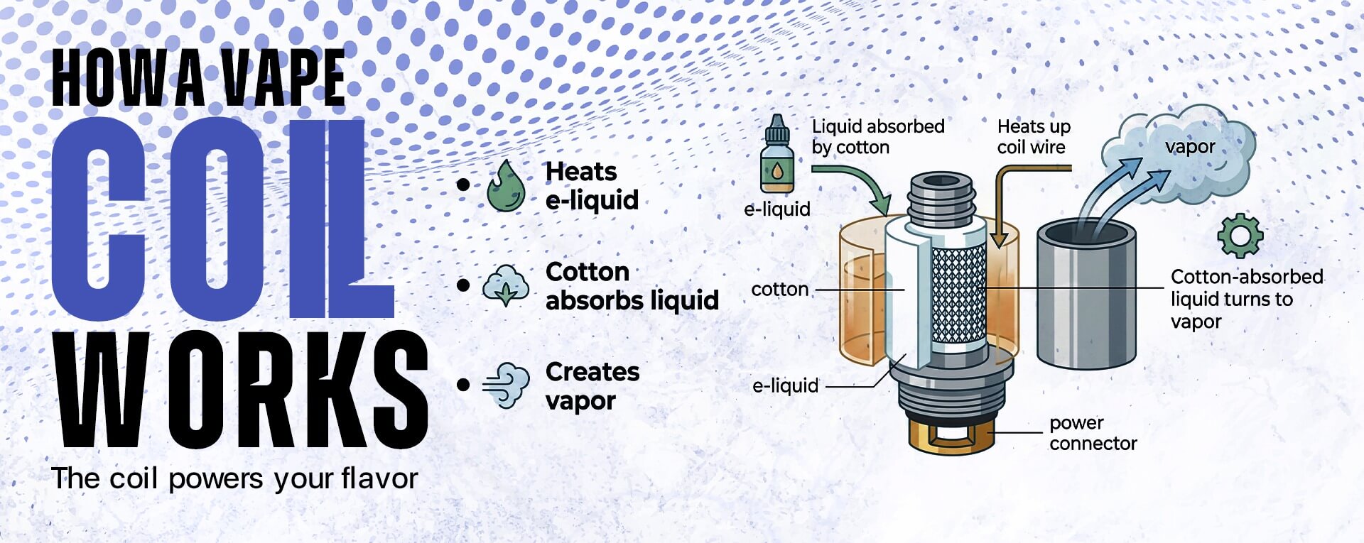 The coil is the part that heats your e-liquid and turns it into vapor. Inside the coil, there is cotton that absorbs the liquid. When you take a puff, the coil heats that liquid and creates vapor.
