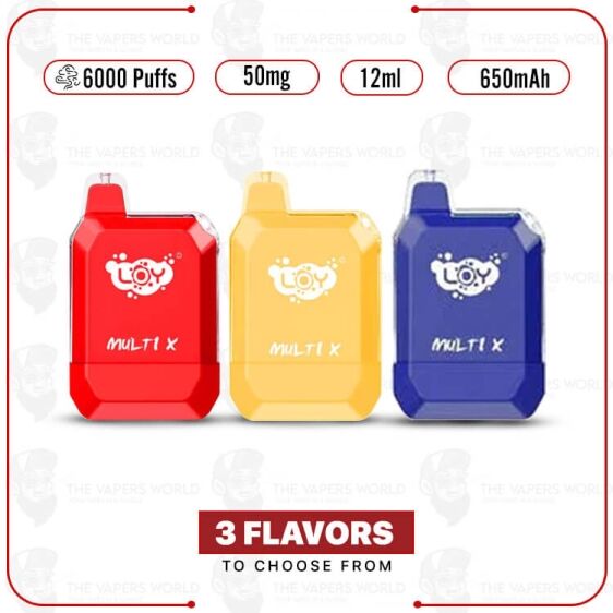 The Loy Multi X Disposable Vape provides you with up to 6000 puffs. It has 12 ml e-liquid and 5% nicotine strength.