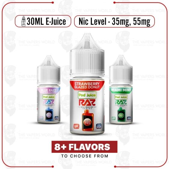 Experience smooth, tobacco-free vaping—shop Pod Juice x RAZ Salt E-Liquid today at The Vapers World!